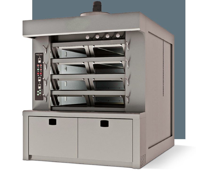 للاحتياج الإنتاجي المرن، تأتي الأفران الدوّارة بسعات 8 أو 10 صواني لمقاسات 40×60 أو 50×70، وتتوفر بإصدارات مع قاعدة دعم أو مع غرفة تخمير مسخنة ومرطّبة أسفل الفرن، أو تخمير زائد غرفة خبز كهربائية بينية لاستخدامات متقدمة. وتتميّز Zucchelli بسرعة التوريد من المصنع خلال أيام قليلة، ما يقلّل زمن الانتظار ويُسرّع الانطلاق التشغيلي للمشروعات الجديدة أو توسعات الأفران القائمة.