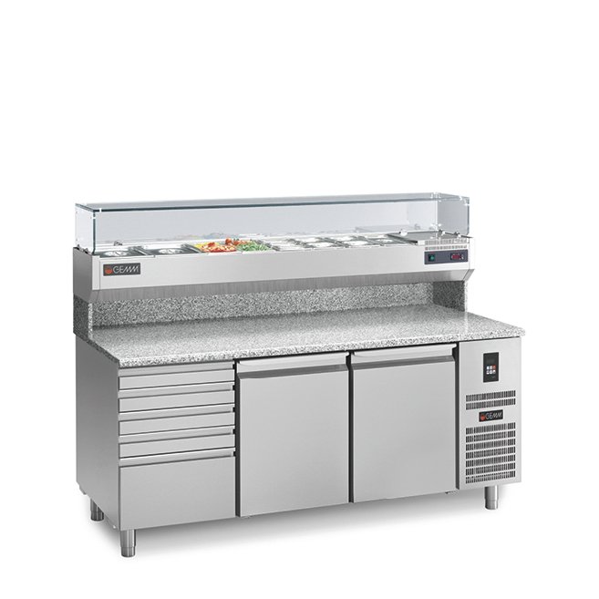 كونتر تحضير بيتزا مبرد PC200C: تخزين مثالي للمكونات، درج 5 أقسام، قاعدة مبردة 3 أبواب، سطح غرانيت مع واقي خلفي، عرض GN مبرد. قطع غيار أصلية مدى الحياة من إيجي تل حصرياً! (152 حرف)